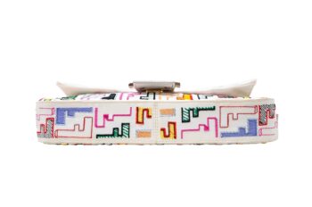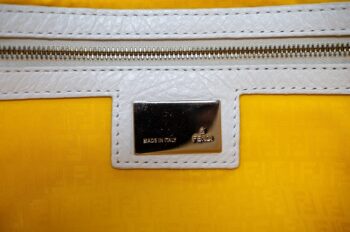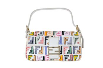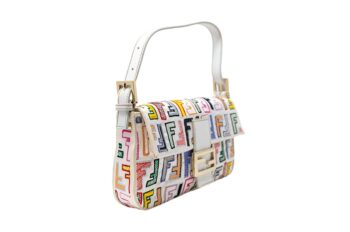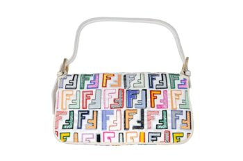 | d | Get ready to turn heads with this vibrant Fendi Baguette! Made from durable white nylon with a multicolored Fendi logo and gold-tone hardware, this. It comes with long shoulder strap that allows you to wear it as a crossbody bag, making it both practical and stylish. Don't miss out on this chic and eye-catching Fendi Baguette! |
