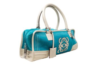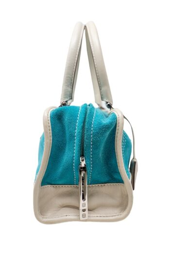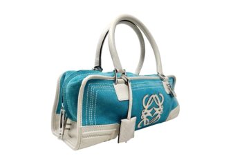 | d | The Loewe Amazona Leather Bag is crafted in blue suede with white leather trims and two rolled top handles, finished with silver-tone hardware. Making it a standout vintage piece. |