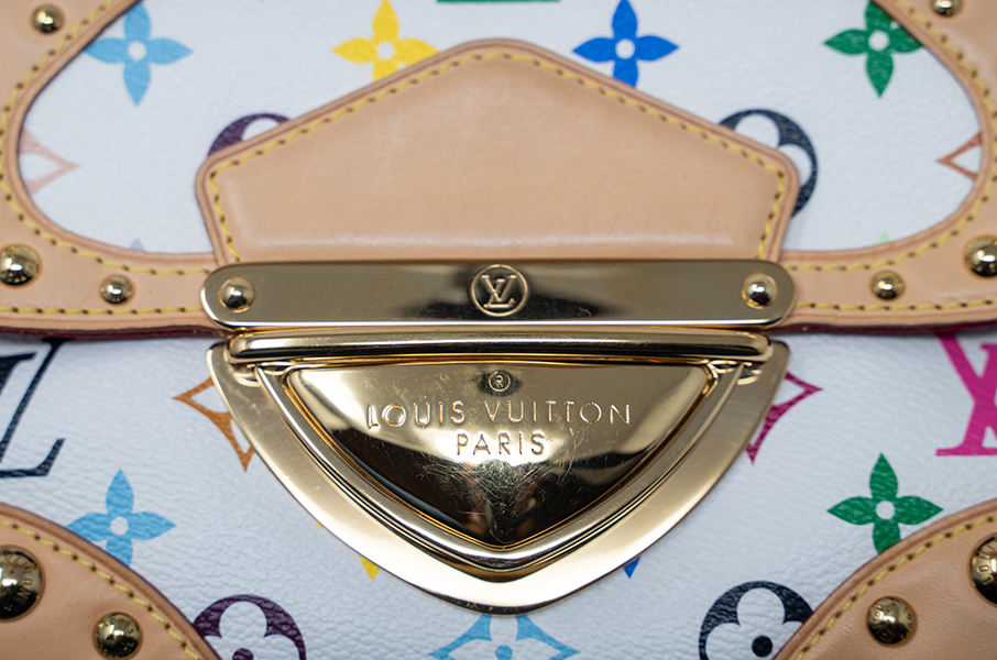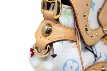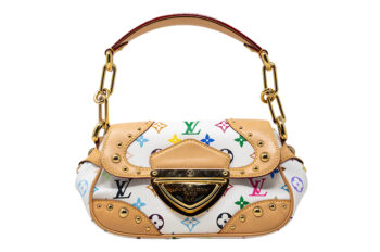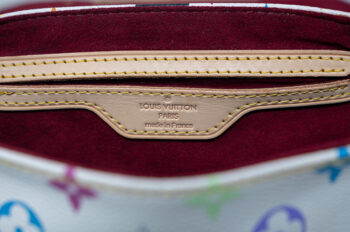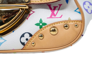 | Description | An iconic Louis Vuitton Marilyn tote crafted in white Multicolore canvas featuring the house’s vibrant 33-color monogram. Finished with natural vachetta leather trim, brass studs, and a chain-link top handle with leather grip, it opens to a striking raspberry red microfiber interior with a patch pocket. A standout piece perfect for both day and evening wear. |