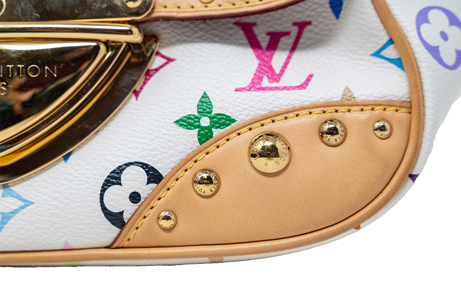 | d | An iconic Louis Vuitton Marilyn tote crafted in white Multicolore canvas featuring the house’s vibrant 33-color monogram. Finished with natural vachetta leather trim, brass studs, and a chain-link top handle with leather grip, it opens to a striking raspberry red microfiber interior with a patch pocket. A standout piece perfect for both day and evening wear. |