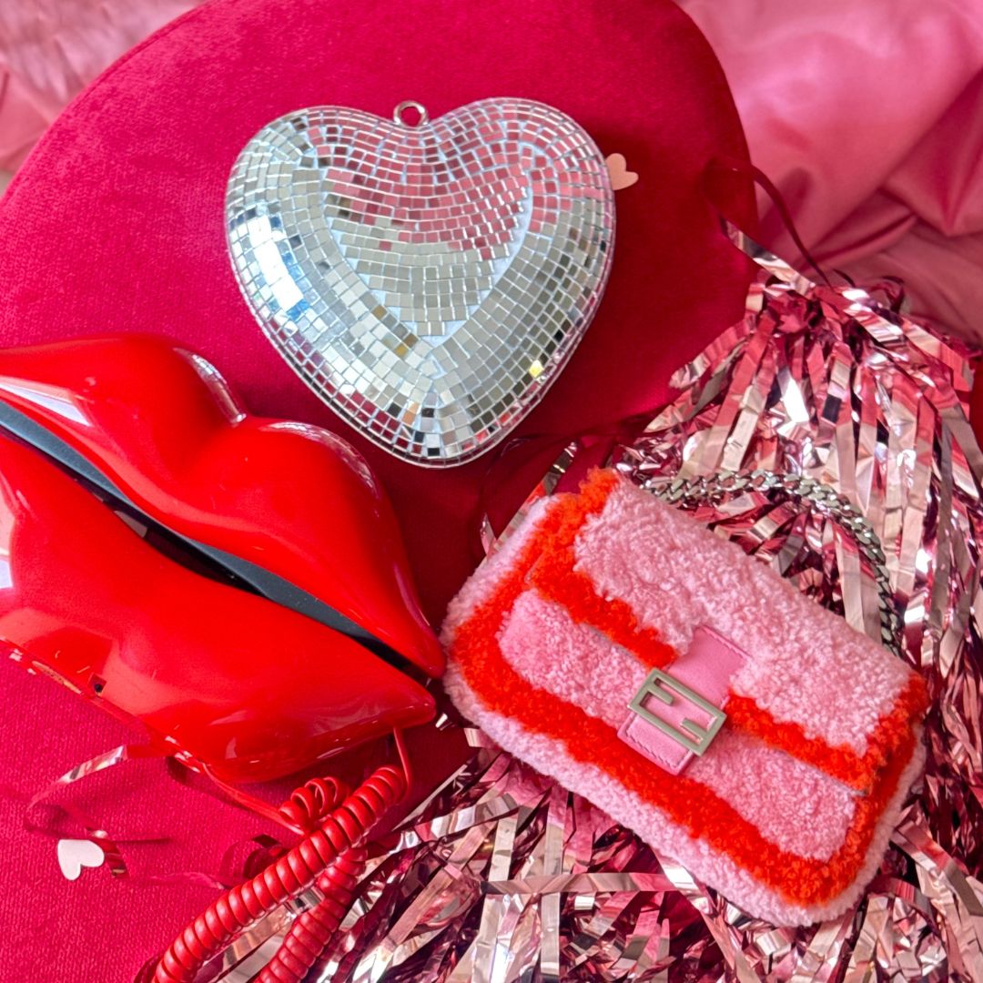 This micro bag is a cozy and ultra-chic statement piece, crafted from plush pink shearling with a bold orange trim for a playful contrast. Perfect for Valentine’s Day, it’s a stylish way to gift a touch of warmth, fashion, and timeless elegance in one petite package.
